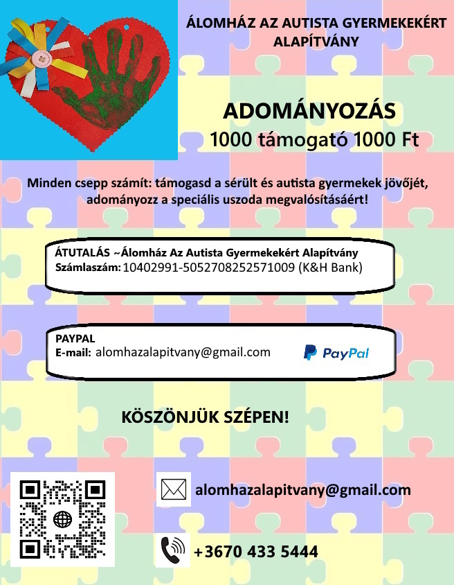 Június hónapban különleges lehetőséget kínálunk Önöknek. Az uszodaépítési tervünk megvalósításához 1000 fő támogatót keresünk, akik minimum 1000 Ft-tal hozzájárulnak a projekt sikeréhez. Ezen uszoda célja, hogy sérült és autista gyermekek számára biztonságos és fejlesztő környezetet teremtsünk.
